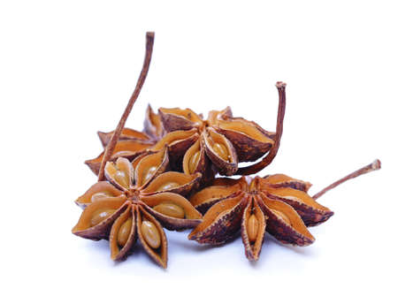 Anise stars on white background. Spices for coffee, hot tea, mulled wine, punch.