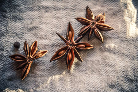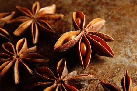 Spices. Anise stars photo. Intentionally blurred lens focus effect. Color toning. Closeup.