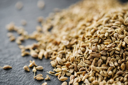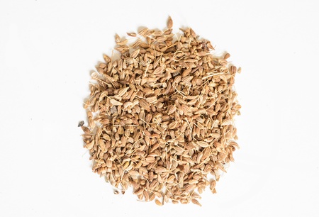 handful of aniseed stretched out on a table with knife and fork and a blue paper napkin