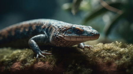 Black blue tongued lizard in dark shiny mirror environement.