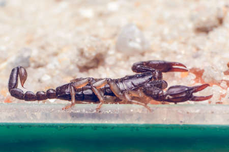 Scorpion creeps on the sand close up.