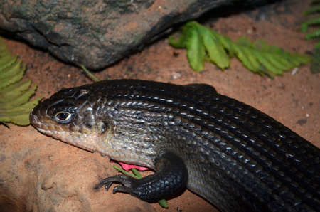 Common blue-tongued lizard with tongue out close up. Portrait of an exotic pet on rock in the studio. Tiliqua scincoides in studio