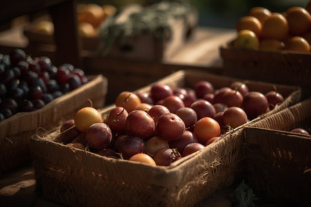 Fresh plums in a basket at a farmers market. Selective focus