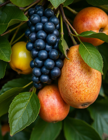 Ripe pears and grapes on a branch in the garden.