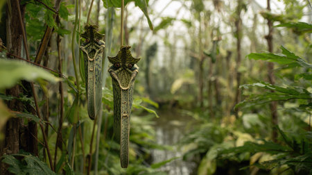 Two carnivorous plants, likely pitcher plants, are hanging from above in a lush greenhouse environment. The plants are a muted green tone and display intricate details. The background features a dense array of other plants, creating a tropical or jungle-like atmosphere.
