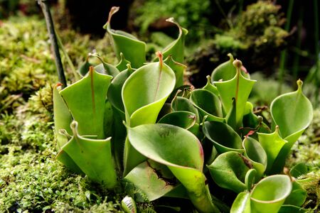 Close-up of carnivorous plants Heliamphora among other carnivorous plants. Soft focus