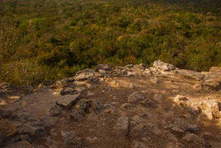 Ancient Mayan pyramids in the jungle Coba. Archaeological excavations of the Pyramid of Coba, Yucatan, Mexico. Sun rays and scattered light.