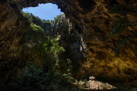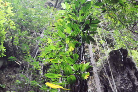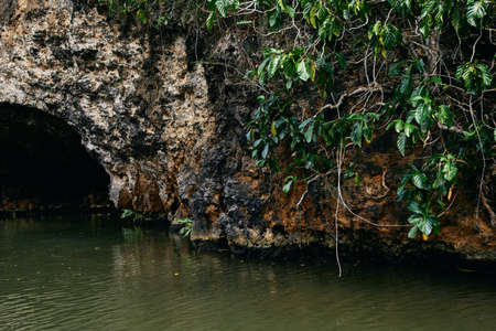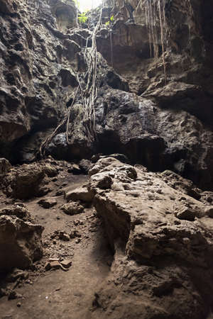 Lush green leaves thrive on a branch emerging from the shadows of cueva de chico cave in the Dominican Republic