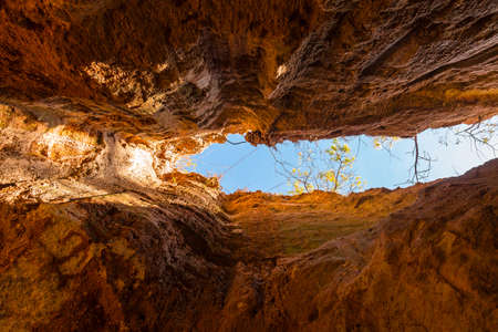 Crevice in the red loamy wall of Providence Canyon bottom view in sunny day, USA