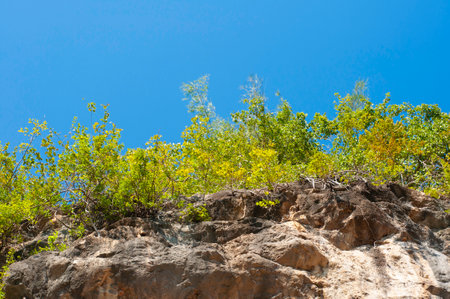 Green tree with blue sky on mountain cliffGreen tree with blue sky on mountain cliff
