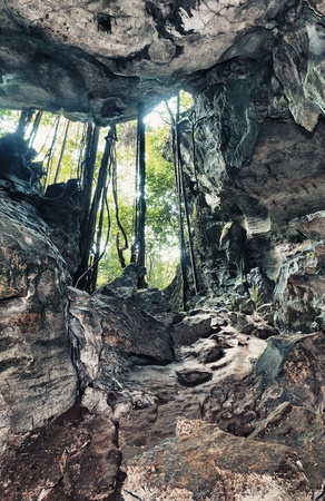 Misty sunbeams illuminate a cave entrance opening to a dense tropical forest
