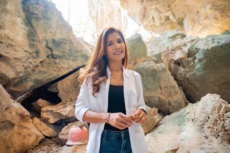 Asian woman with Tham Phra Sabai background, Lampang province.
