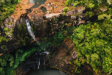 Aerial view from above of the Tamarin waterfall seven cascades in the tropical jungles of the island of Mauritius.