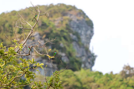 Blue-tailed bee-eater, A bird caught a branch and flew in the sky in Thailand.