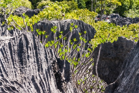 Curiously strange rock formations of fantastically eroded limestone spires, known as Tsingy in amazing Park Ankarana, Madagascar wilderness