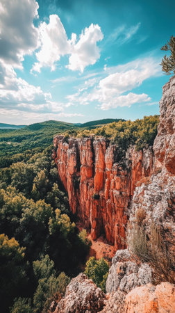 A stunning rock formation rises majestically with vibrant greenery against a bright blue sky filled with fluffy white clouds, showcasing nature's beauty.