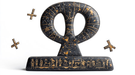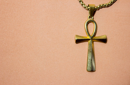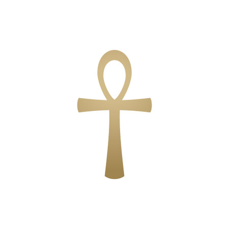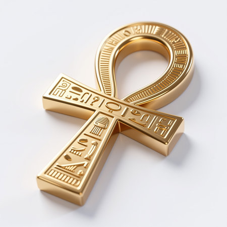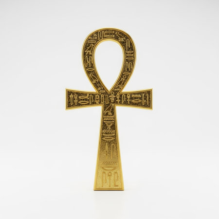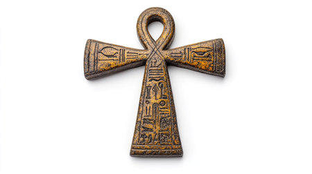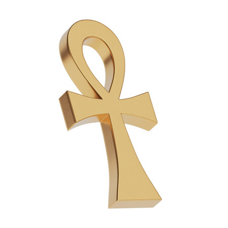 A close-up shot of a golden ankh symbol, a key of life, against a clean white backdrop. The ankh is a prominent symbol in ancient Egyptian culture.