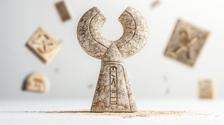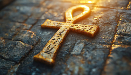 Ankh symbol carved into a textured sandstone slab, illuminated by warm sunlight. represents life, eternity, and ancient egyptian culture. historical artifact detail.