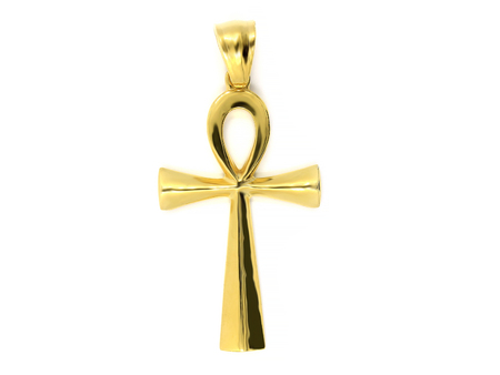 Ankh of brushed gold on white background.