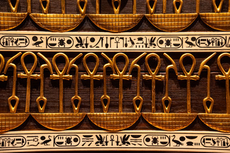 Ancient Egyptian hieroglyphs and ankh symbols gold relief detail,ornate patterns