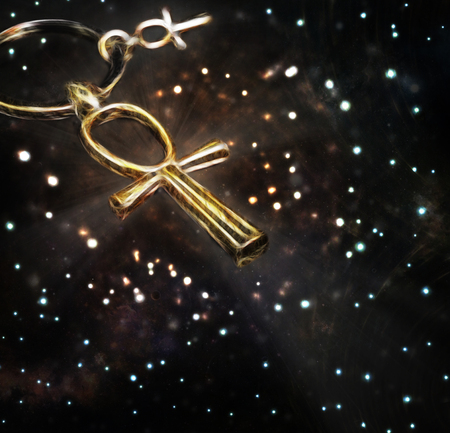 Stylized Egyptian ankh cross on a space background with stars and nebula.