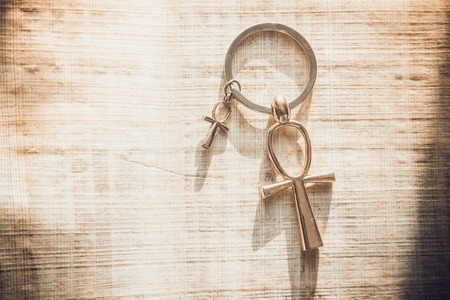 Ancient Egyptian ankh symbol on a wooden background.