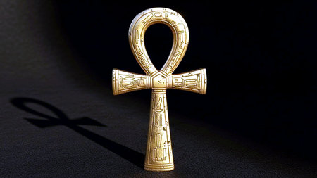 Image showcases a detailed golden Ankh against a white background with subtle shadowing. The Ankh features intricate designs on the crossbar and handle, rendered in a sleek, metallic style,.