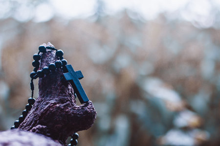 Wooden rosary with cross - with bokeh in background