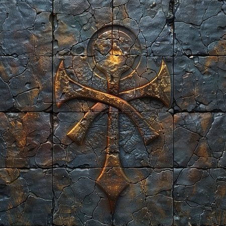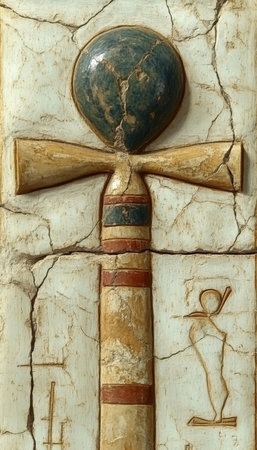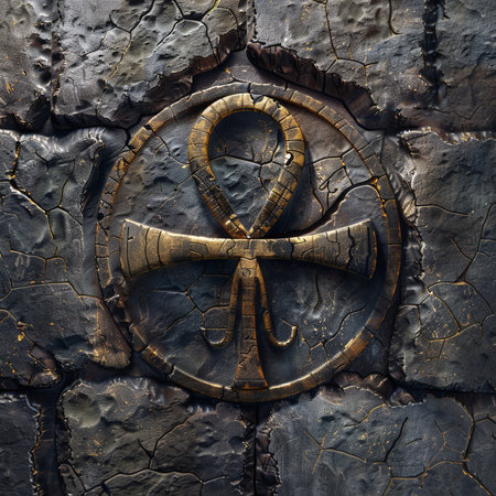 Closeup of carved ankhs on temple wall, side lighting, symbol of life, ancient beliefs