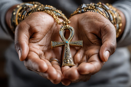 Hands showcase a beautifully designed ankh pendant along with numerous colorful bracelets in focus.