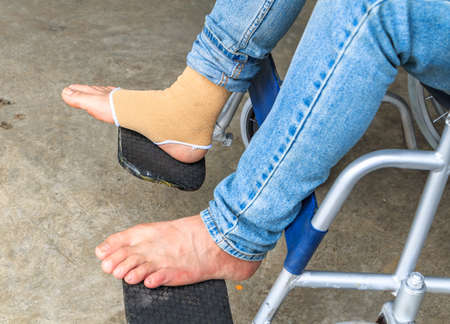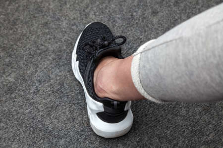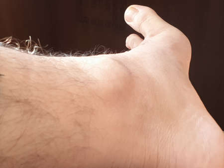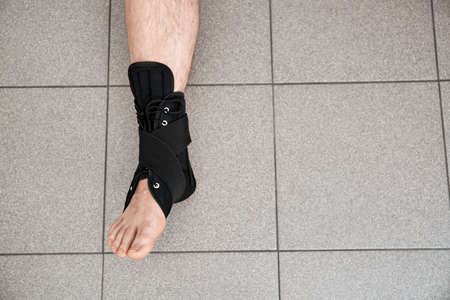 The male leg is fixed in a medical bandage. Ankle fracture or sprain. Lacing and tight fit of the foot. A healthy and diseased part of body. Post-fracture therapy and development. Treatment accesuare.