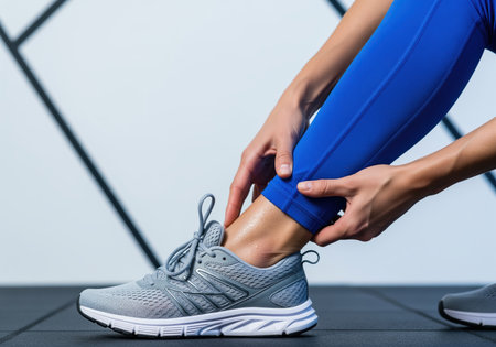 An athlete wearing blue leggings and grey sneakers holds her lower leg and ankle, indicating pain or strain after strenuous exercise.