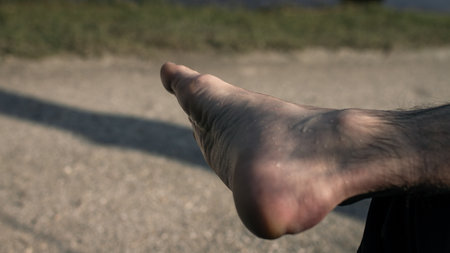 Close-up of a bare foot resting outdoors on a sunlit gravel path, showing natural skin texture and subtle details. The background is blurred, creating a contrast between sharp focus and soft scenery. Captured in the Netherlands, Europe.