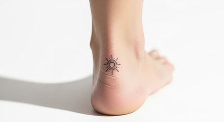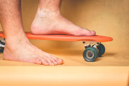 Man's feet with skin pigmentation problems on the ankle, with a red scooter on a yellow background.