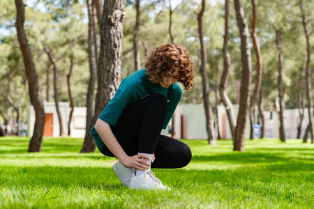 Young redhead woman wearing green t-shirt and black leggings suffering from an ankle injury while exercising and running. Healthcare and sport concept. Ankle sprung.