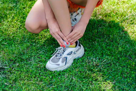 Young brunette woman wearing turquoise tee and orange short on city park, outdoors suffering from an ankle injury while exercising and running. Healthcare and sport concept. Ankle sprung.