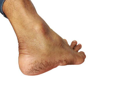 Inflammation of Asian young man’s ankle joint and foot. Concept of joint pain and leg problems. Isolated on white.