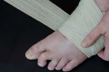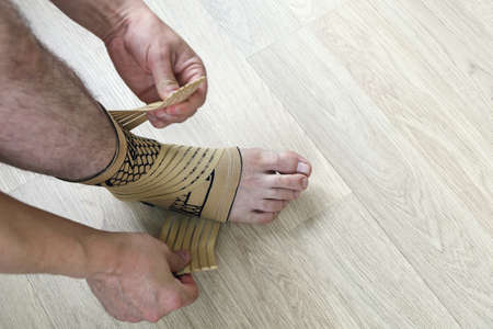 Middle-aged Caucasian man produces an independent bandage of his dislocated leg. He puts an elastic bandage over his swollen shin. First aid in sprains and dislocations. Bandage stabilizes ankle joint.