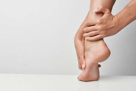 Woman suffering from heel pain. Inflammation or sprain of the tendon in the foot, heel spur, bursitis. The concept of diseases and pains in the leg