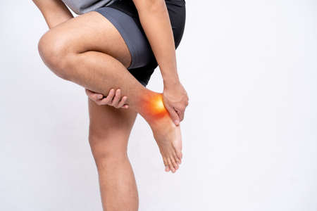 Runner sportsman holding ankle in pain with Broken twisted joint running sport injury and Athletic man touching foot due to sprain on white background