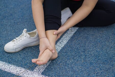 Young woman touching her painful ankle,suffering from ankle injury while exercising and running, Sport and exercise concept.