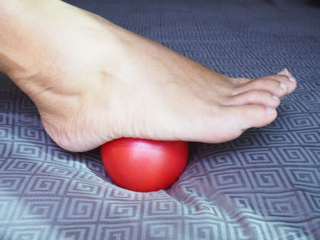 Female feet and soles of the heel with heel pain in adults and Treatment of Plantar Fasciitis. foot inflammatory ligament disease.