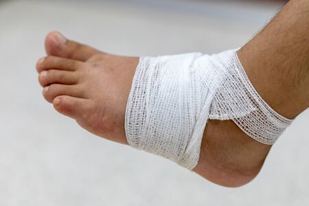 Mans ankle in compression bandage. Leg injury while trail running outdoors. First aid for sprained ligament or tendon.