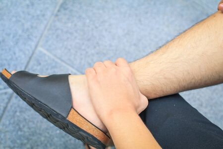 Young man put his hand on his ankle. He has pain. Concept of medicine, massage, physiotherapy.
