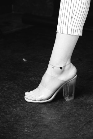 Close-up of female legs and hands with henna tattoo on the feet. Black and white photo. Gently feminine graceful decoration, respect for a woman, love and take care of yourself.