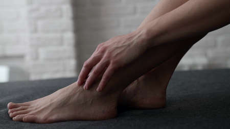 female feet on bed or couch, woman is stroking her skin by fingers, closeup view