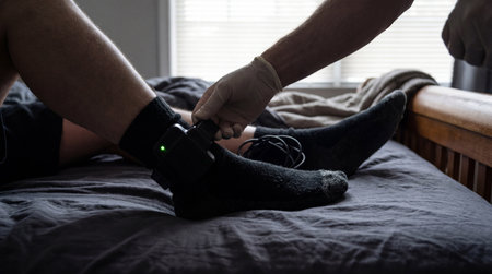 Man wearing electronic ankle monitor while sitting on bed in dimly lit room under supervision of healthcare or law enforcement worker.