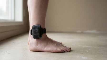 Barefoot person standing indoors with an electronic ankle monitor tracking device on lower leg near window light.