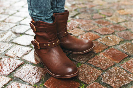 Two unrecognizable fashionable women wearing stylish shoes outdoor. Boots perfect for autumn and winter