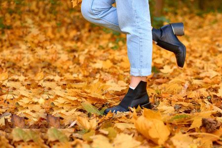 Unrecognizable woman wearing black warm shoes boots in autumnal style. Footwear for autumn weather concept. Female around orange leaves.